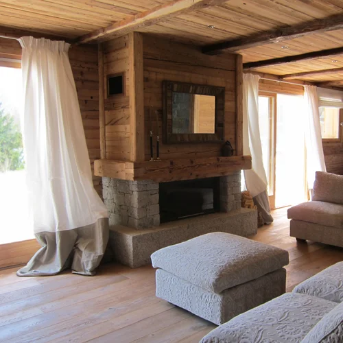 Chalet. Progetto di arredamento tessile: Nicoletta Gatti. Tende dalla caduta abbondante arredano la grande vetrata. Tessuto Rubelli, raso di cotone mercerizzato. Divani dalla linea squadrata, tessuto "Kieffer" by Rubelli in ciniglia disegno tono su tono. Camera da letto: la coperta di pelliccia è reversibile, doppiata con un tessuto jacquard figurativo (chinoiserie).