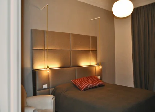 The color choices throughout the home constitute a play of contrasts: neutral grays blend with burned oranges in a predominantly masculine environment. Luxuriously oversized, but elegantly proportioned sofas. Lights play a fundamental role, minimal in the detail of the fixtures themselves to give emphasis instead to the play of light on walls and architectural features. The bespoke bed features a decorative padded headboard and discreet shelving.