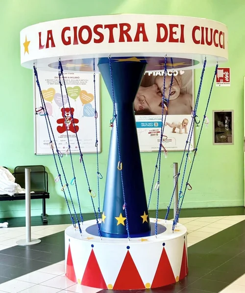 Le progettiste hanno rivisitato la tradizione nordica degli alberi su cui i bambini sono soliti lasciare i loro ciucci, ideando una GIOSTRA DEI CIUCCI in linea con la cultura e tradizione italiana in cui la giostra evoca i momenti più giocosi dell'infanzia.